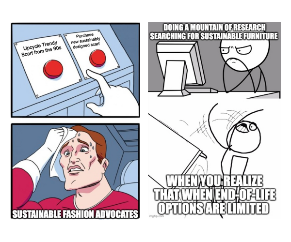 But for now, this meme will represent my personal experience with sustainable fashion and furniture.